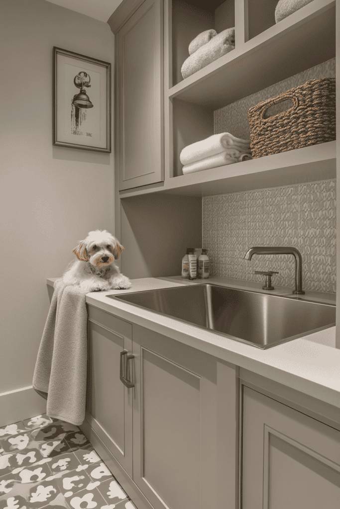 While your laundry room may be small, it can still serve as a practical pet washing station, making bath time for your furry friend a breeze. Start by designating a corner or area with a small, waterproof basin or a deep laundry sink. This makes it easy to wash off dirt and fur without creating a mess. Install a handheld showerhead for thorough rinsing, and consider adding a non-slip mat for your pet’s comfort and safety.