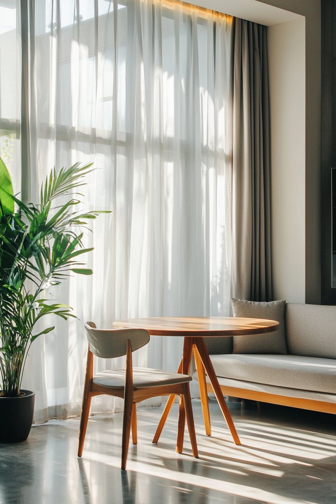Don’t forget to reflect on functionality; choose easy-to-operate drapes or blinds for convenience. By incorporating curtains, you’re not just decorating; you’re elevating your studio into a versatile haven that adapts to your lifestyle.