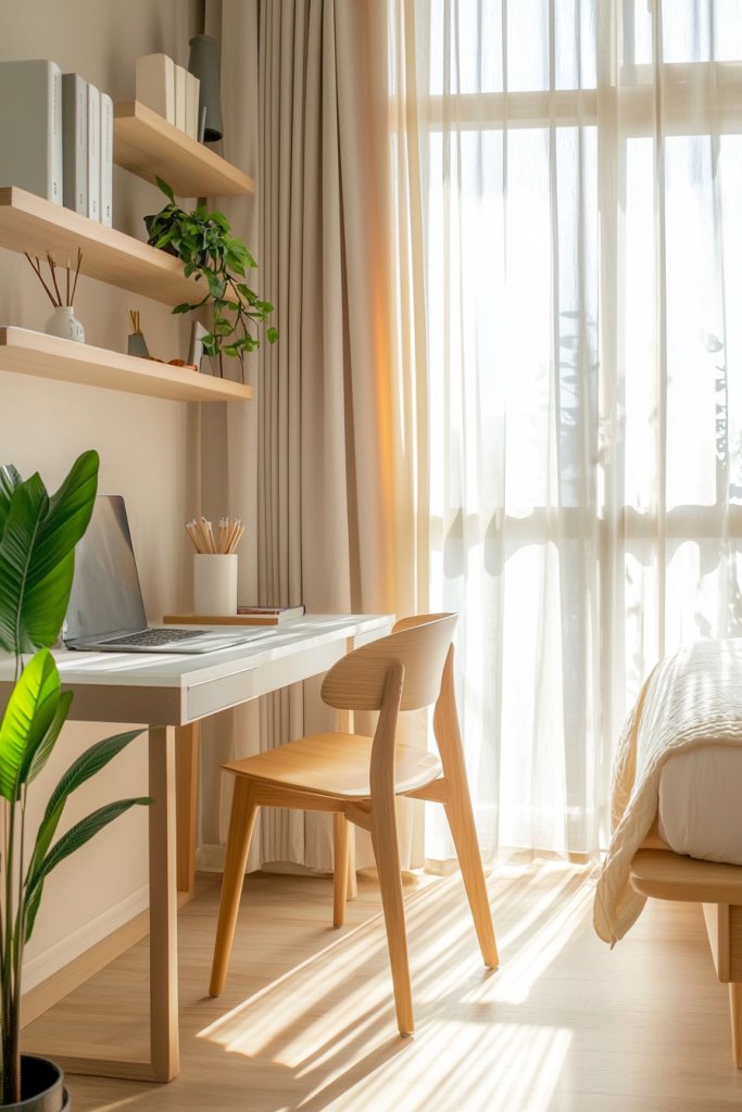 Consider wall-mounted shelves to hold your essentials, freeing up precious floor space. Use a comfortable chair that complements your decor, ensuring you’re cozy during long work hours.