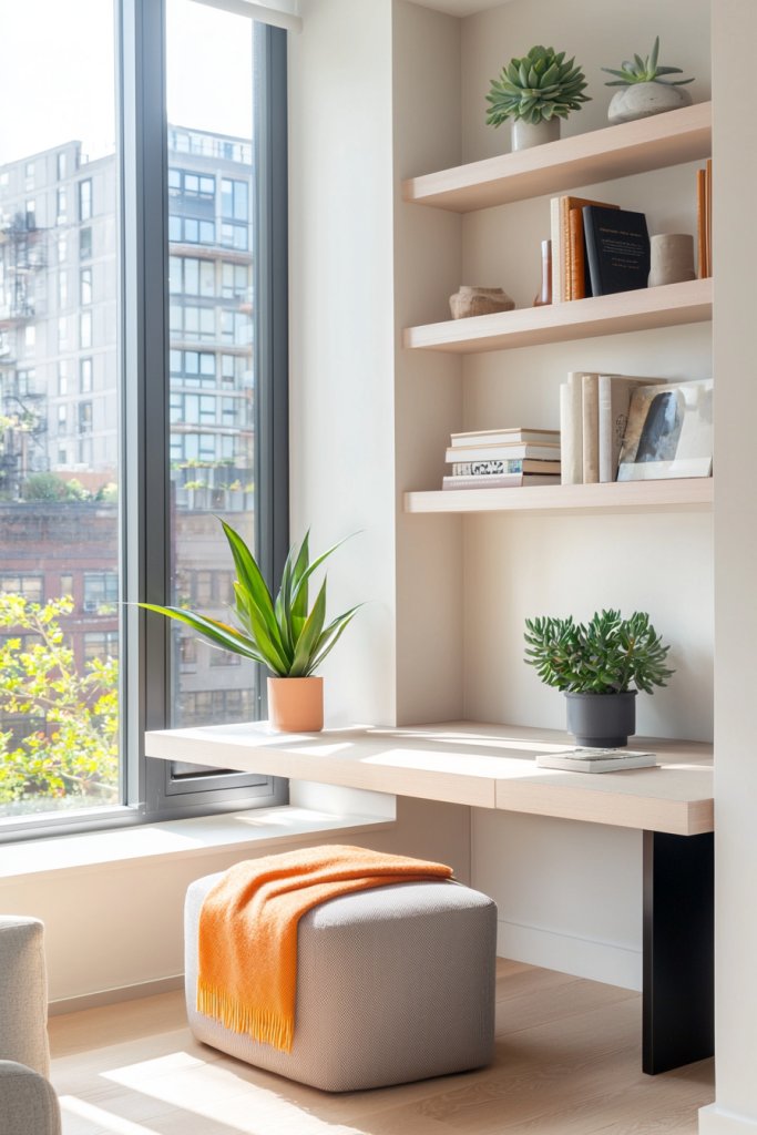 If you’re looking to maximize storage without overwhelming your small studio, installing floating shelves is a game-changer. These sleek, minimalist shelves free up floor space while adding visual interest to your walls.