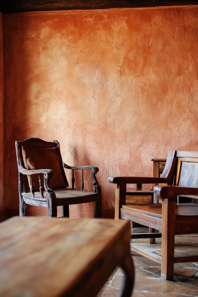 Imagine walking into a room where the walls are covered in textured terracotta tiles or painted in rich terracotta hues. The warm, burnt-orange tones evoke desert sunsets, while the textured surface adds depth and tactile interest. Light reflects softly off the textured surface, giving the space a cozy glow. You might see a fireplace framed with rustic brick or a feature wall with hand-painted patterns that echo Southwestern motifs.