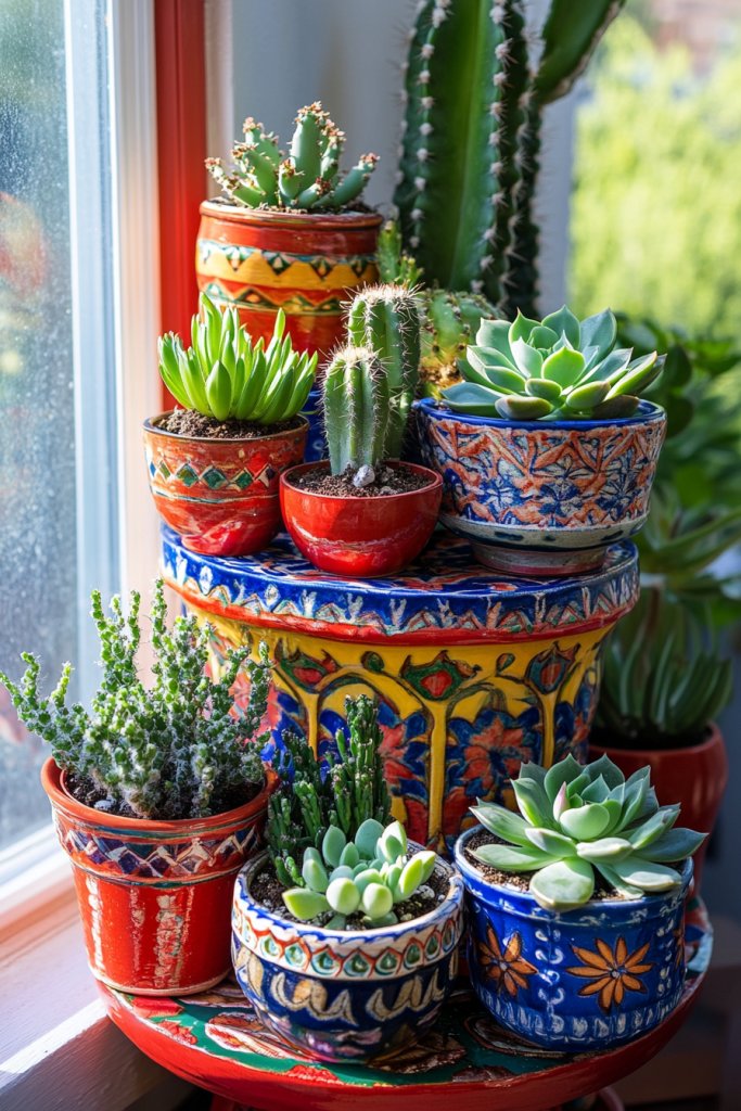 Imagine a corner of your living room filled with small to medium-sized cacti and succulents in vibrant, patterned ceramic pots. The shapes vary from tall, spiky saguaro-like specimens to rosette-forming succulents. The pots, in shades of turquoise, orange, and terracotta, contrast beautifully with the green plants and add regional artistry. The scene evokes a sunny desert landscape, full of life and regional authenticity.
