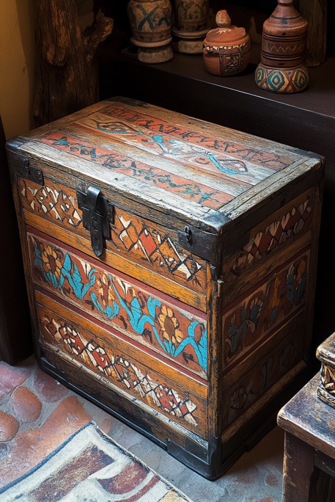 Want to add both storage and style? Vintage trunks and regional artifacts with Southwestern motifs serve as functional decor that tells a story. They bring an authentic, layered look to your space while providing practical storage options. If your home feels cluttered or lacks character, these pieces can create focal points that double as conversation starters.