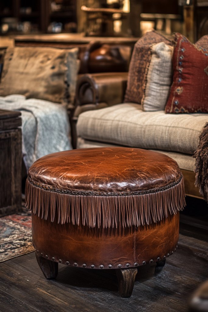 Choose ottomans with distressed or aged leather for an authentic look, or go for faux leather with a matte finish for a budget-friendly option. Decorate with fringed throws or layered cushions for extra coziness. The size and shape can vary—round, rectangular, or square—depending on your space. Seasons can influence styling: add a soft cream or earth-toned throw during winter or keep it minimal with just the fringes in summer. Pair with leather or wood furniture for a cohesive rustic aesthetic.