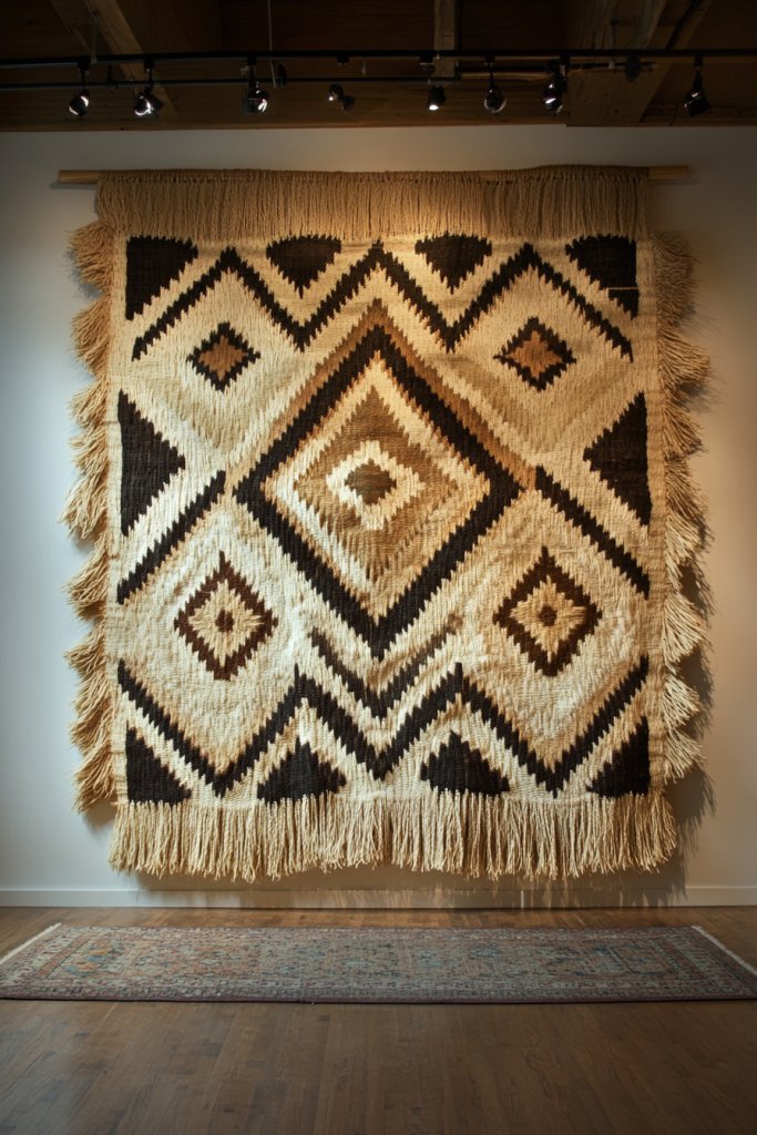 Imagine a large, intricately woven tapestry with earthy tones and geometric patterns hanging above a cozy sofa. The fibers catch the light, revealing subtle variations in color and texture. Nearby, baskets and woven shelves create a layered, tactile display that echoes regional craftsmanship. The overall effect is cozy and inviting, with a sense of handcrafted artistry that enriches the space.