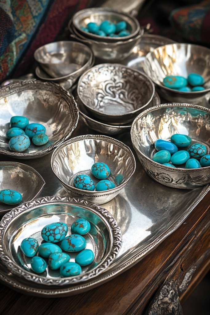 Imagine a vintage silver tray with turquoise inlays sitting on a sideboard, holding a collection of regional jewelry-inspired trinkets. Nearby, a turquoise-studded bowl or a silver-framed mirror reflects the warm glow of ambient lighting. The worn patina of silver contrasts beautifully with the vibrant blue of turquoise, creating a layered, textured look. These elements evoke old trading posts and desert landscapes, adding a sense of history and craftsmanship.