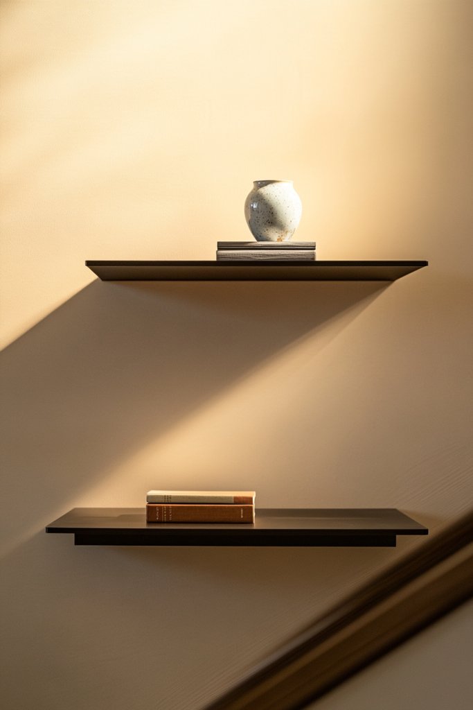 Imagine a set of slim, matte-finished shelves mounted along the wall, holding a row of neatly stacked books, decorative vases, and a few curated trinkets. The shelves float seamlessly, creating a modern, airy feel that opens up the area. Soft lighting from above highlights the textured finishes and adds warmth. The visual flow guides your eye effortlessly from one piece to the next, turning the landing into a mini gallery.