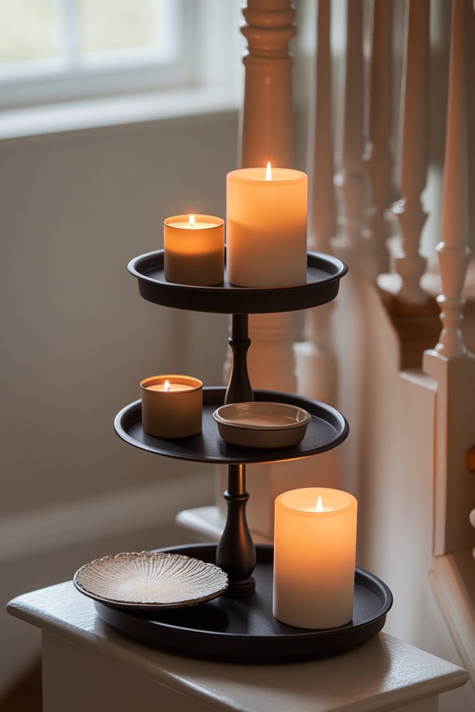 Looking to create a cozy, inviting atmosphere on your staircase landing? A tiered display of candles and decorative trays can instantly add warmth and charm. It’s an easy way to elevate the ambiance, perfect for relaxing evenings or entertaining guests. Who doesn’t want a space that feels like a retreat?
