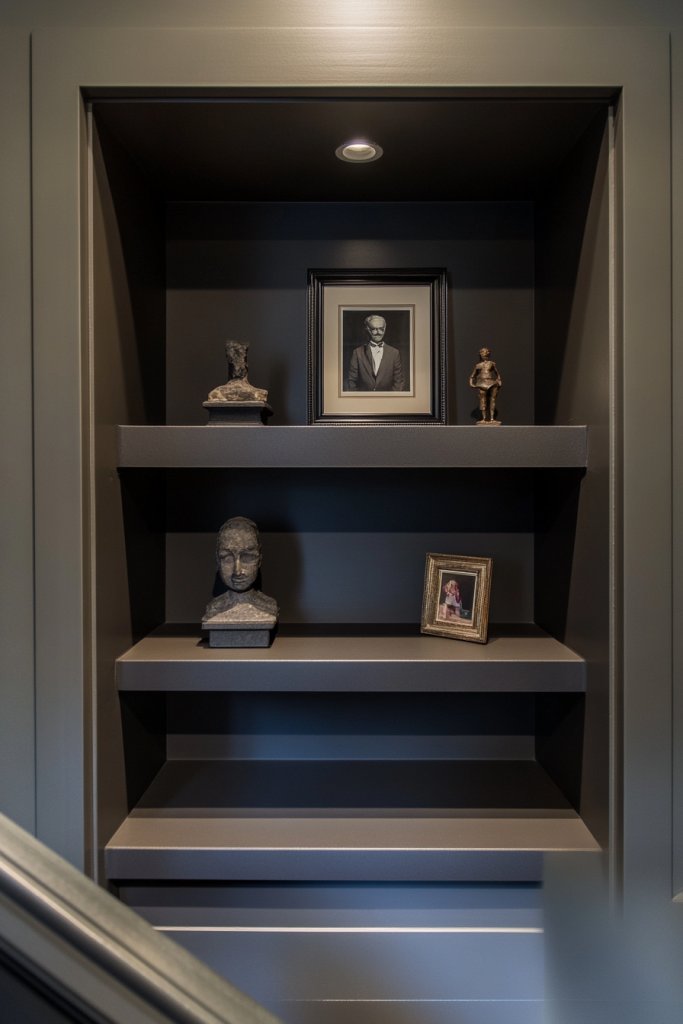 Visualize a recessed wall section with open shelves crafted into the wall itself. Inside, you can display curated objects—like vintage trinkets, small sculptures, or special keepsakes—carefully arranged for maximum impact. Backlighting or accent lighting illuminates your display, creating a gallery-like effect. The surrounding wall is painted in a contrasting color or textured finish, drawing attention inward.