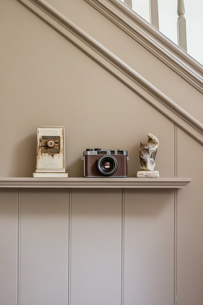 Want to add personality and character to your staircase landing? Showcasing vintage or artistic collectibles can turn a plain space into a curated display. It’s a chance to highlight your interests and style while creating a conversation starter. Plus, it adds a layer of sophistication and nostalgia.