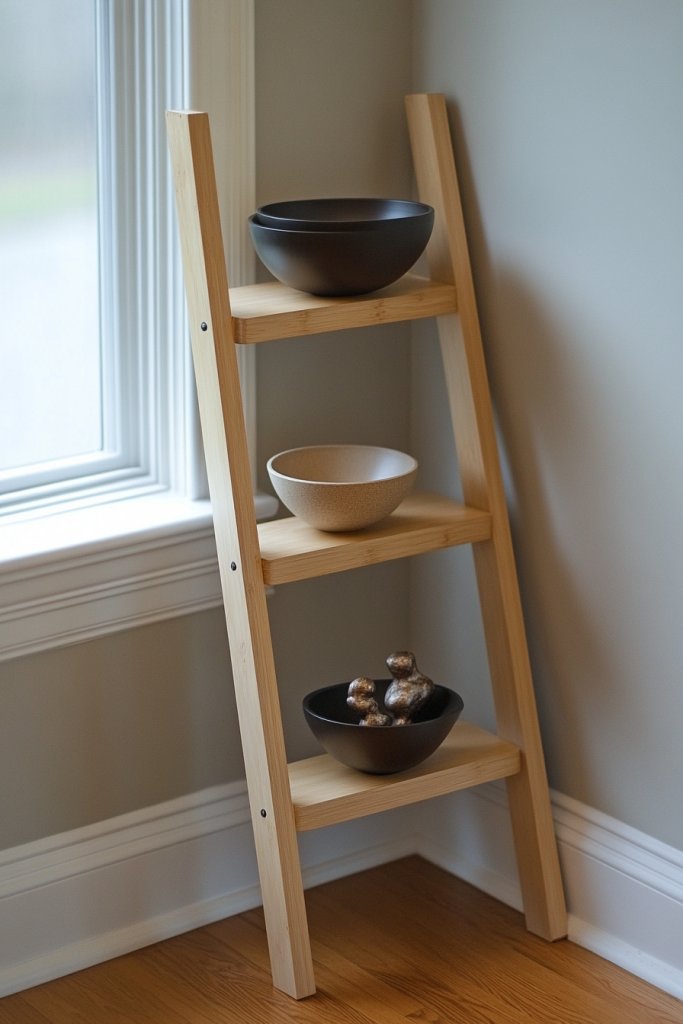 Visualize a wooden ladder leaning against the wall, with rungs holding woven baskets filled with scarves, hats, or small decor accents. The staggered shelves create a sense of movement, guiding the eye upward. The natural wood finish adds warmth, while the arrangement feels inviting and curated. It’s a functional art piece that enhances your space.