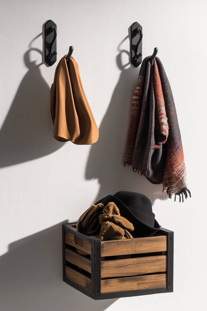 Imagine a row of sturdy hooks mounted at different heights, each holding a bag or scarf. Beneath or beside, small wooden or metal crates are attached to the wall, perfect for shoes, gloves, or small accessories. The setup creates a layered look, balancing functionality with style. Subtle decorative touches like painted labels or colorful crates add personality.