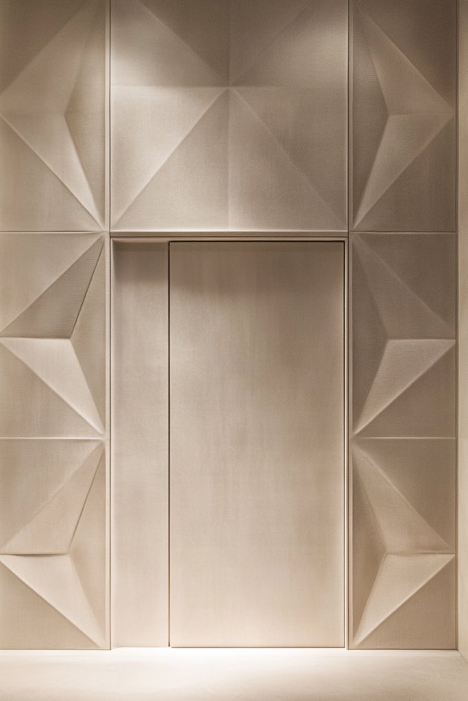 Imagine a large decorative panel made of carved wood, textured fabric, or geometric tiles, mounted flush against the wall. Behind or within the panel, hidden compartments store small items or accessories. The front acts as a statement piece, with intricate details that catch the eye. Soft lighting enhances the textures and depth, making the entire setup both functional and artistic.