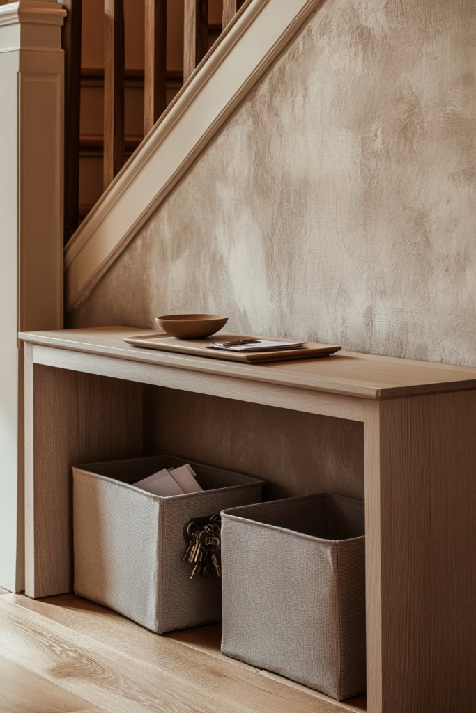 Picture a narrow, sleek table with a matte black finish, topped with a soft, textured runner. Baskets or woven bins sit underneath, holding everything from umbrellas to loose change. On top, a decorative tray neatly gathers your keys and sunglasses, while a small, stylish clock adds function. The overall look is tidy, inviting, and effortlessly chic, making the landing feel intentional.