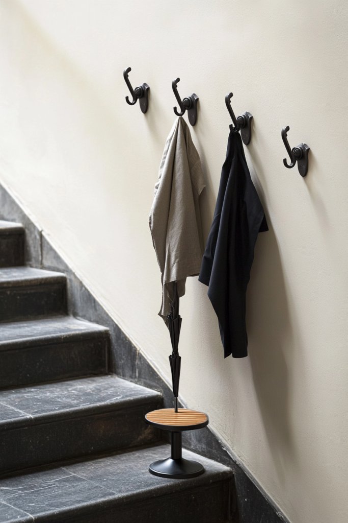 Imagine a row of sleek, matte black hooks mounted at varying heights, each holding a stylish jacket or scarf. Beneath, a sturdy, modern umbrella stand with a geometric design catches drips and keeps umbrellas upright. The hooks are spaced evenly along the wall, creating a balanced look. The area feels tidy, with a sense of order that invites you in and makes leaving the house less stressful.