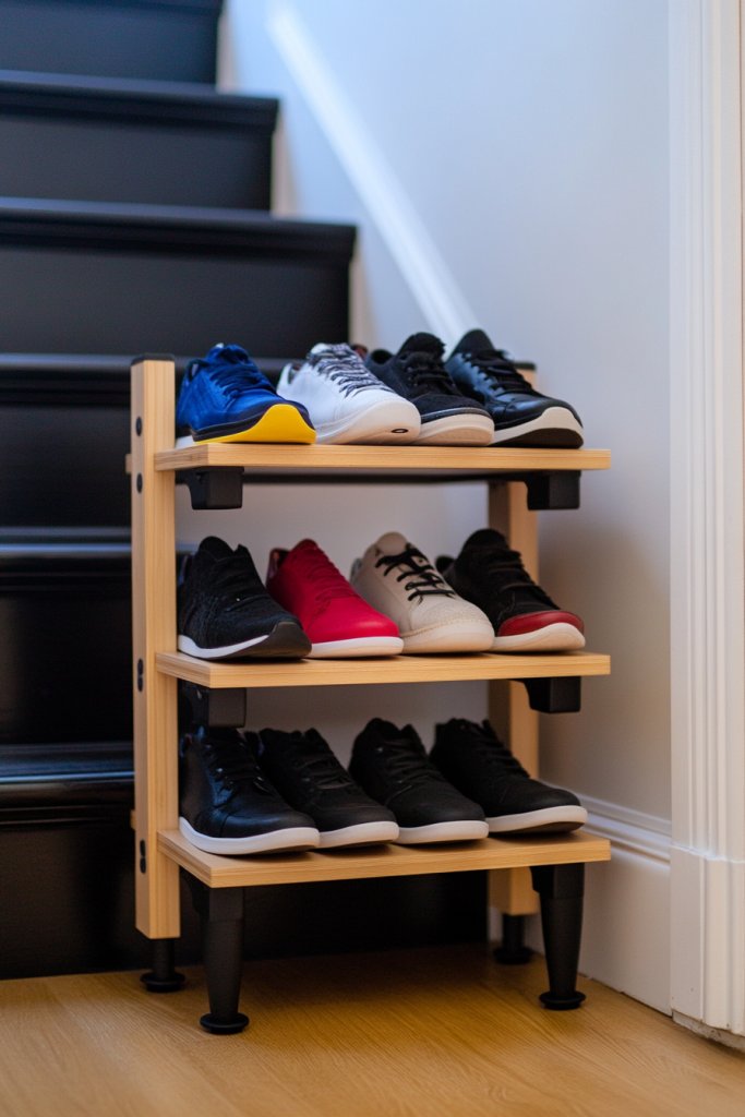 Picture a sleek, multi-level unit made of bamboo or metal with open cubbies or angled trays. Shoes are neatly arranged, with sneakers on one level and dress shoes on another. The design allows for quick visual access, and the open structure keeps everything ventilated and fresh. The overall effect is tidy, modern, and inviting, making your landing look like a dedicated shoe gallery.
