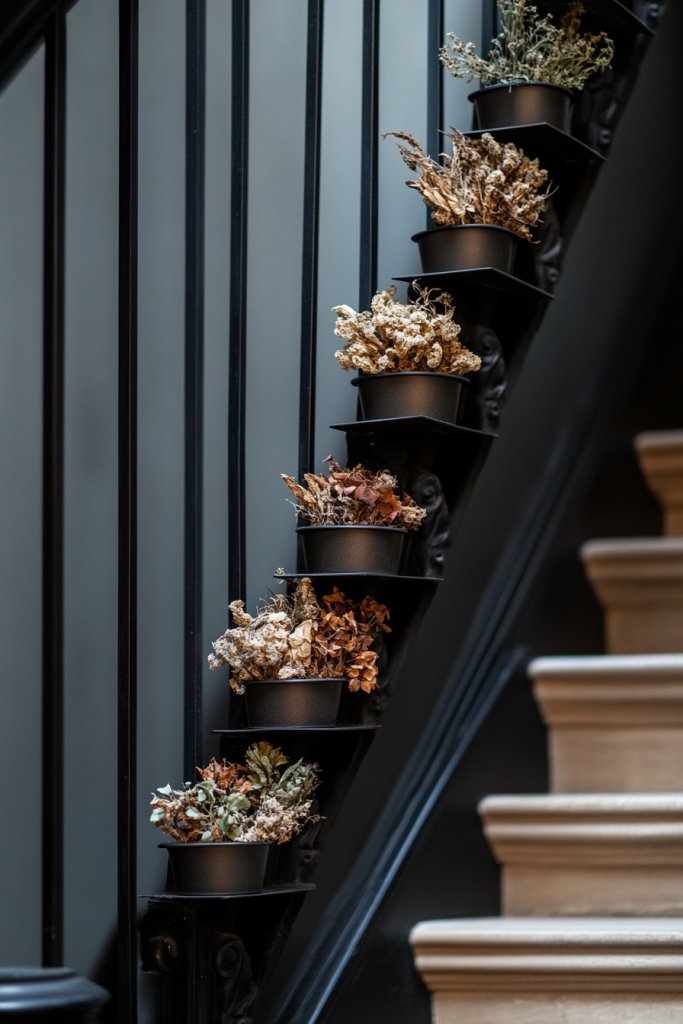 Visualize a sleek wall panel with evenly spaced mounted planters filled with faux succulents or dried floral arrangements. The muted tones and textured containers create a sophisticated backdrop that complements any decor style. The arrangement adds depth and dimension to the wall, transforming the landing into a curated, botanical-inspired space.