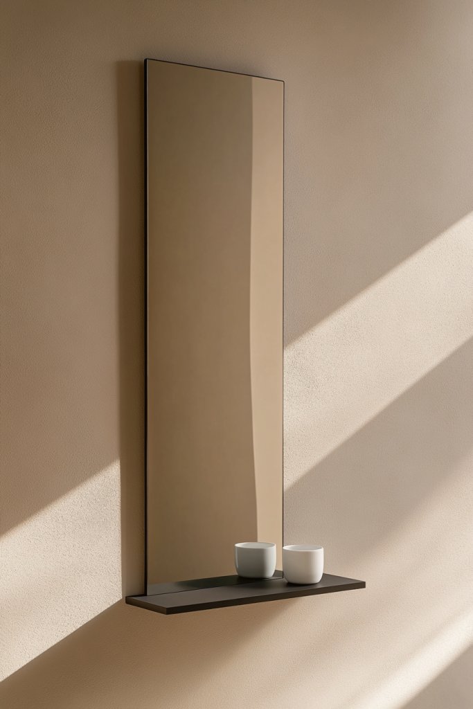 Imagine a tall, narrow mirror with a simple, thin frame mounted at eye level. Below or beside it, a narrow shelf holds a few decorative items—perhaps a small bowl for change or a decorative object like a sculptural piece. The clean lines and reflective surface bounce light around, making the area appear more open and airy. The overall look is fresh, uncluttered, and stylish.