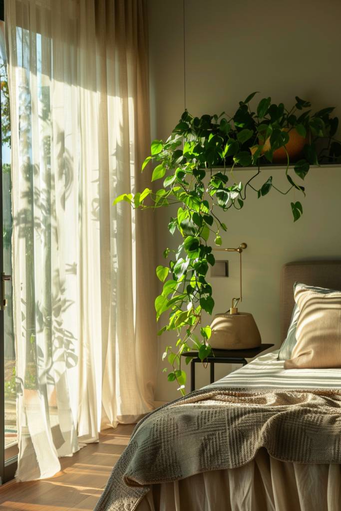 Try placing a few small succulents on your nightstand or a larger fiddle leaf fig in a corner to make a bold statement. Hanging planters can draw the eye upward, making the room feel more expansive.