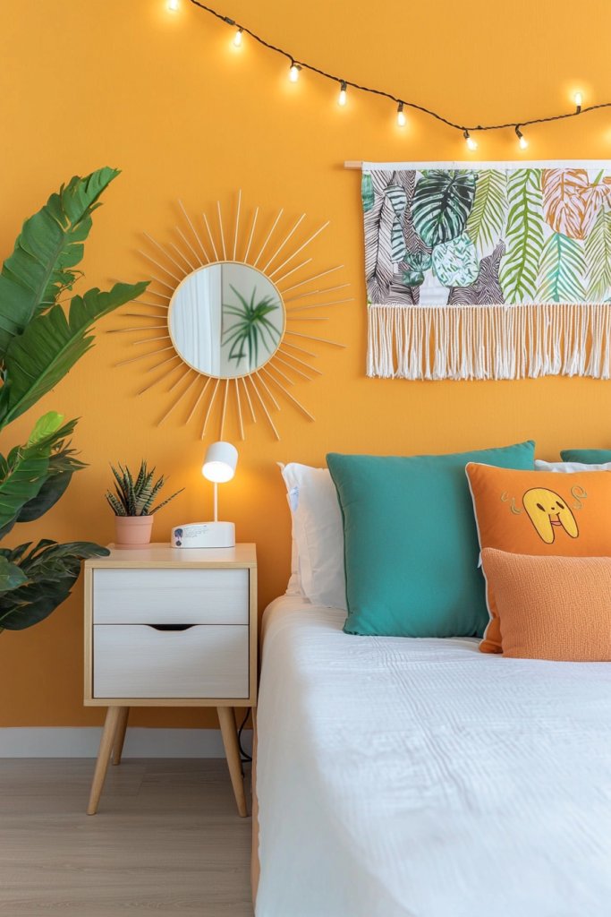 A crisp white ceiling can ground the room, allowing those vibrant colors to pop even more. Textiles like bedding, curtains, and rugs can echo these shades, tying the room together beautifully.