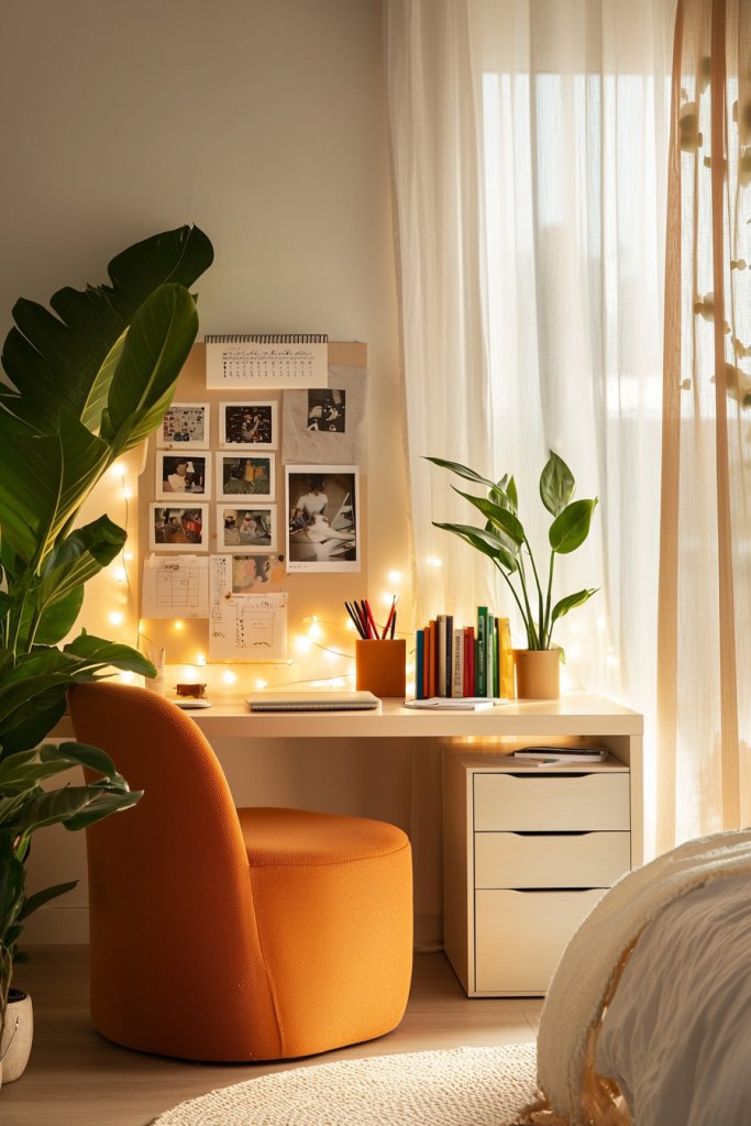With a cozy ambiance set by string lights, it’s time to focus on one of the most important areas of your room: the desk space. This is where creativity meets functionality, so let’s make it uniquely yours.