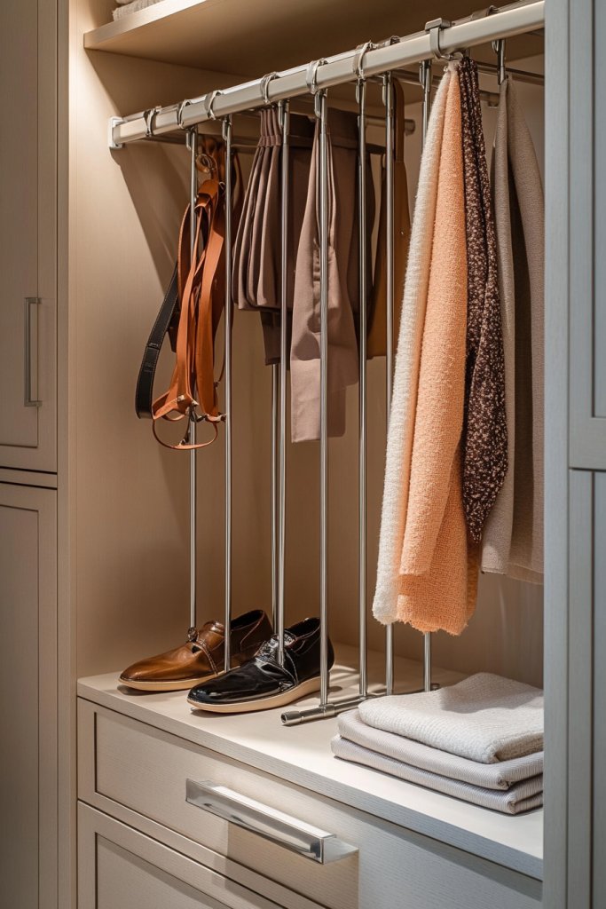 Visualize a closet with a few tension rods installed horizontally at different heights, creating separate sections. Shoes are lined up neatly on one, while scarves and bags hang on another, all easily accessible and organized. The rods are simple, unobtrusive, and adjustable, making the closet look tidier and more functional. It’s a smart way to utilize vertical space without permanent fixtures.