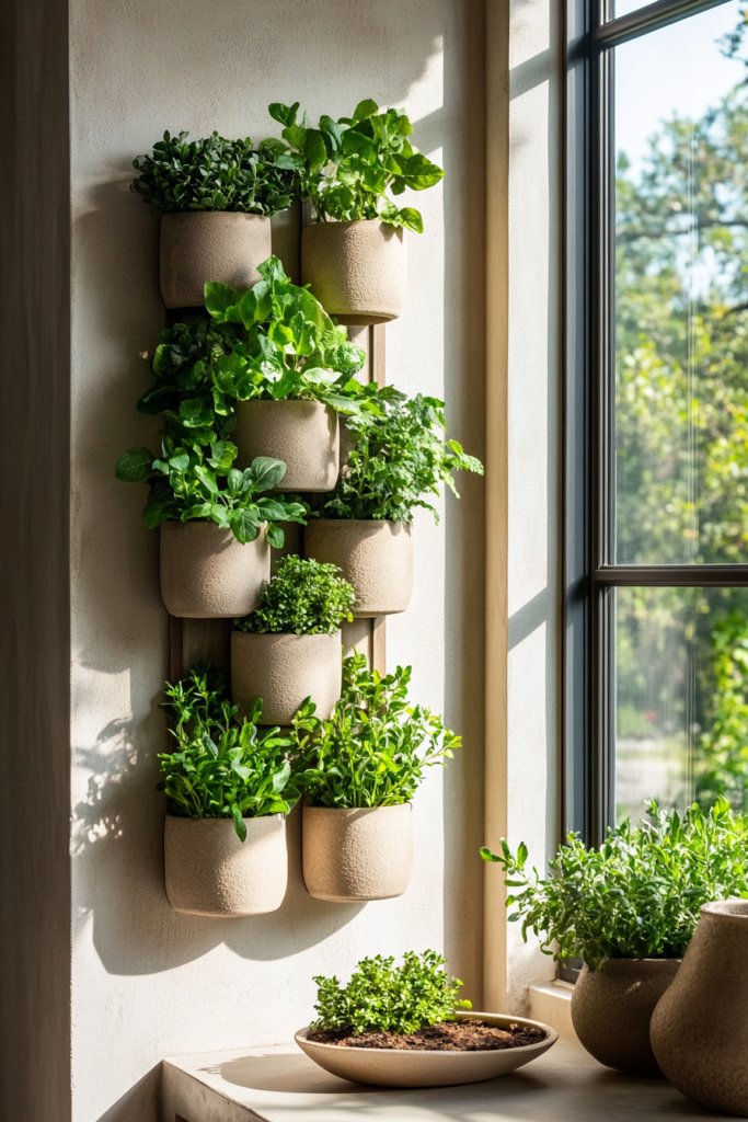Use real herbs like basil or mint for functional greenery, or opt for high-quality faux plants for zero maintenance. Choose different planters—ceramic, wooden, or metallic—to match the decor style. Incorporate wall-mounted pockets or tiered shelves for more plants. Change the arrangement seasonally or as tastes evolve, experimenting with different plant types or styles.