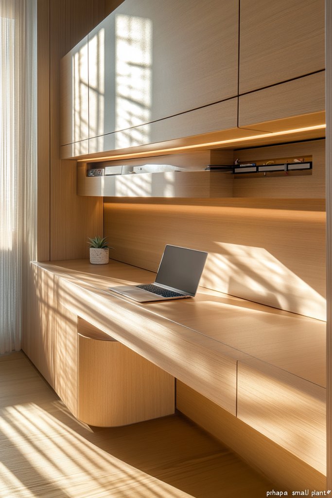 Imagine a slim, modern wall-mounted desk in white or natural wood, seamlessly attached to the wall. Cables run through discreet channels, vanishing behind the panel for a clean look. The surface holds a laptop, a notebook, and a few essentials, while underneath, a hidden drawer stores supplies. The overall vibe is minimalistic, with everything in its place and nothing cluttering the space.