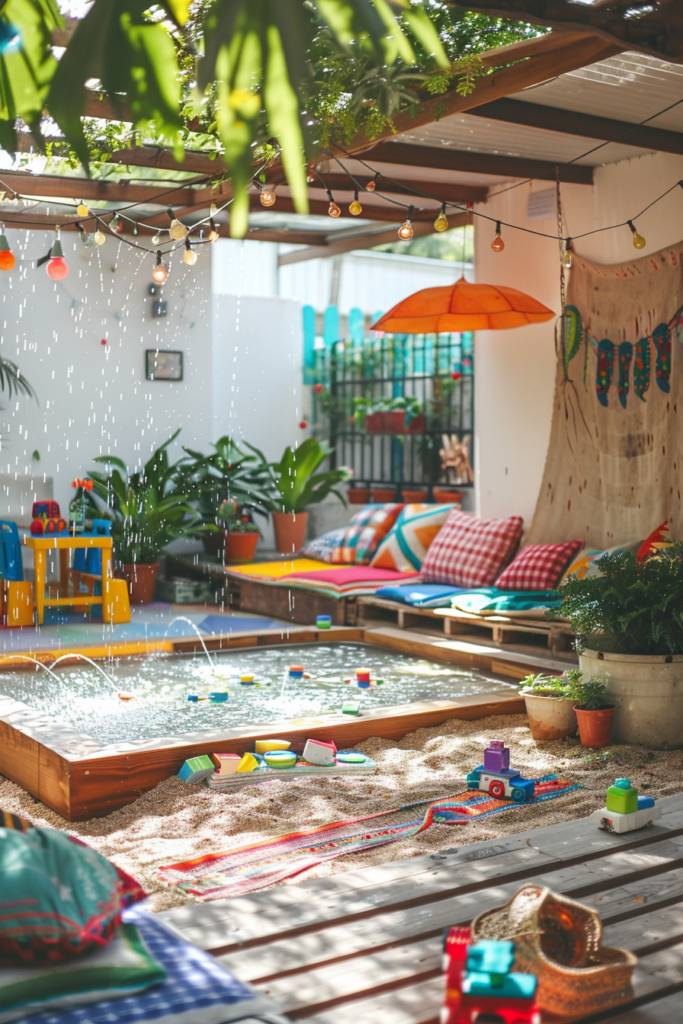 Incorporate multifunctional furniture, like benches that double as storage for toys, to keep the area organized. Add a small climbing structure or a sandbox to stimulate creativity and physical activity.
