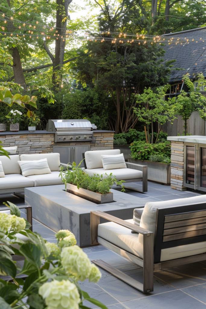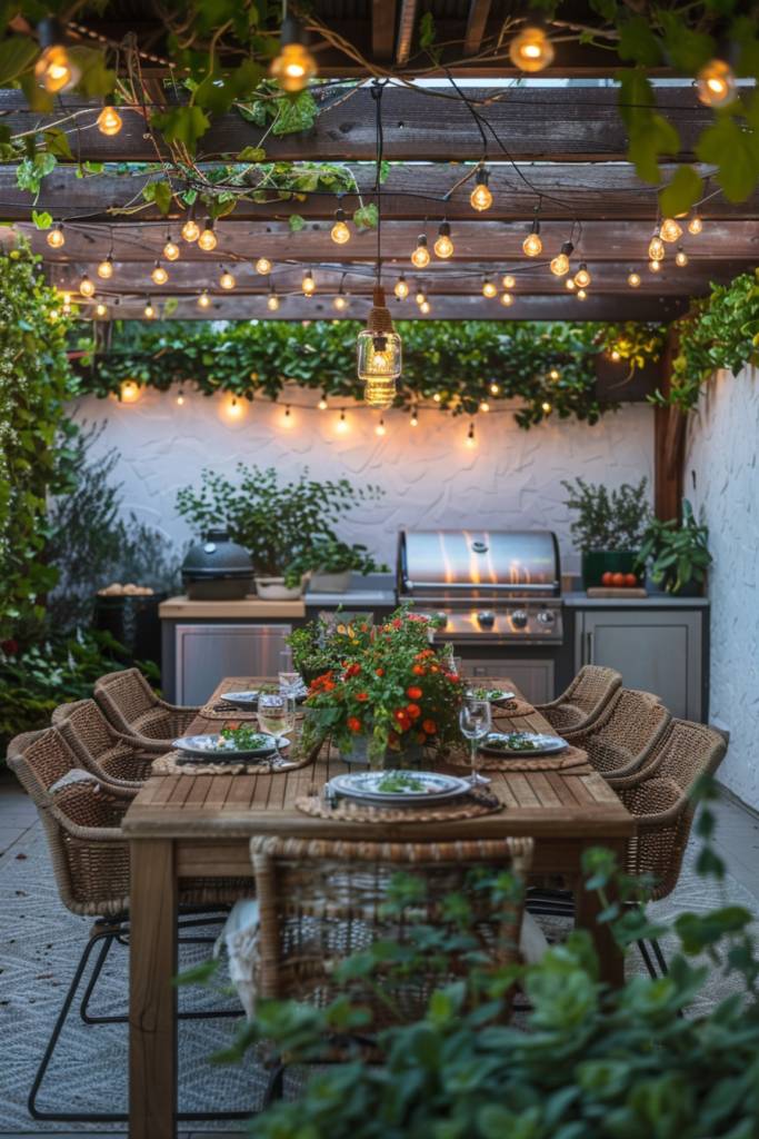 Incorporate natural elements like potted herbs or a vertical garden to enhance the ambiance and provide fresh ingredients for your meals. A pergola or shade sails can add protection from the elements, while string lights create a warm, inviting atmosphere in the evening.