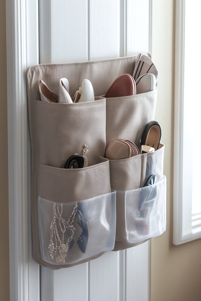 Visualize a sleek fabric pocket system hanging on the inside of your door, filled with your favorite shoes or neatly rolled scarves. Each pocket offers a designated spot, eliminating the mess of shoes piled on the floor. Small hooks hold your belts or bags, turning a plain door into a functional display. The whole setup blends seamlessly into your space, making everything easy to see and grab.