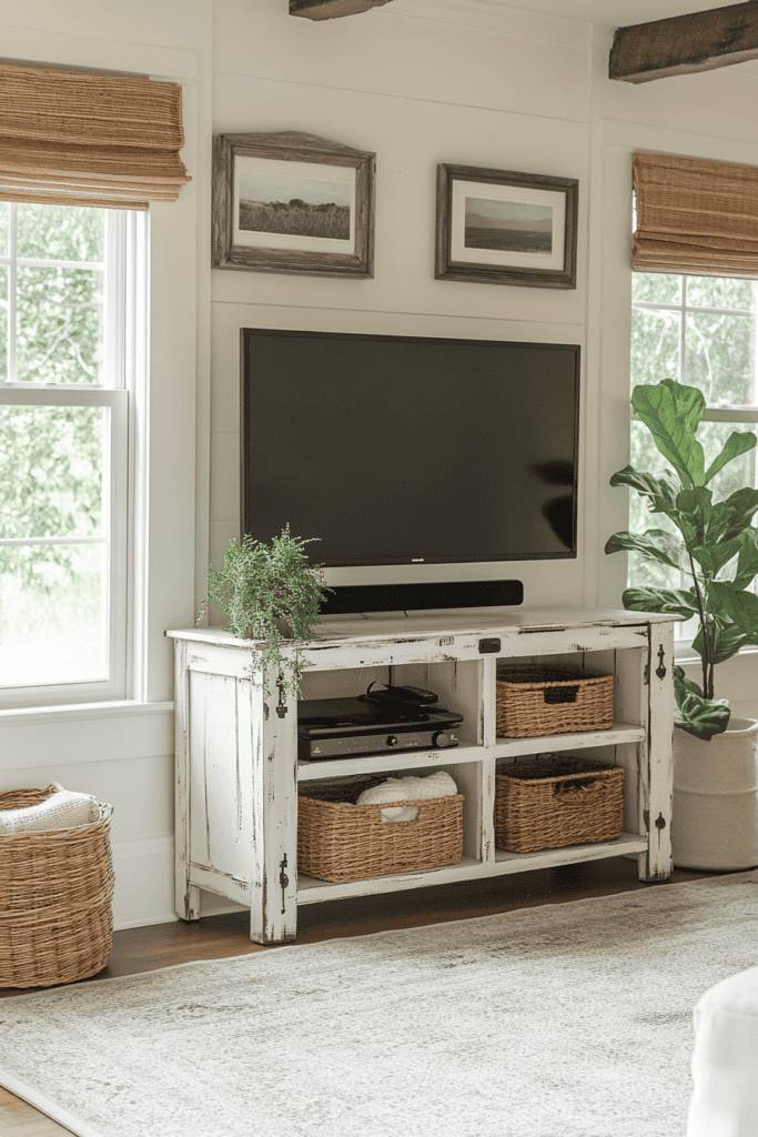 The practicality of farmhouse TV stands is just as appealing. They often provide ample storage, with cabinets or drawers to neatly tuck away DVDs, gaming consoles, and remotes, keeping your space clutter-free.