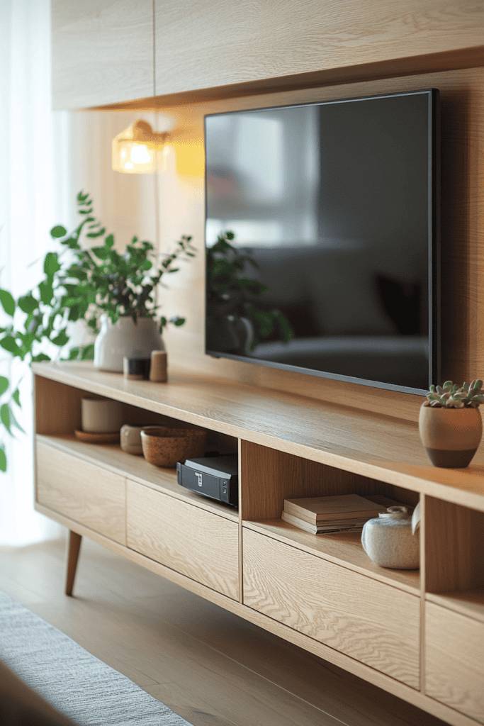 You can choose materials like reclaimed wood or metal to reflect an eco-conscious ethos while adding personality. An artistic TV stand can also serve as a backdrop for your favorite decor pieces, enhancing the overall aesthetic of your room.