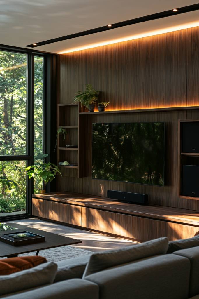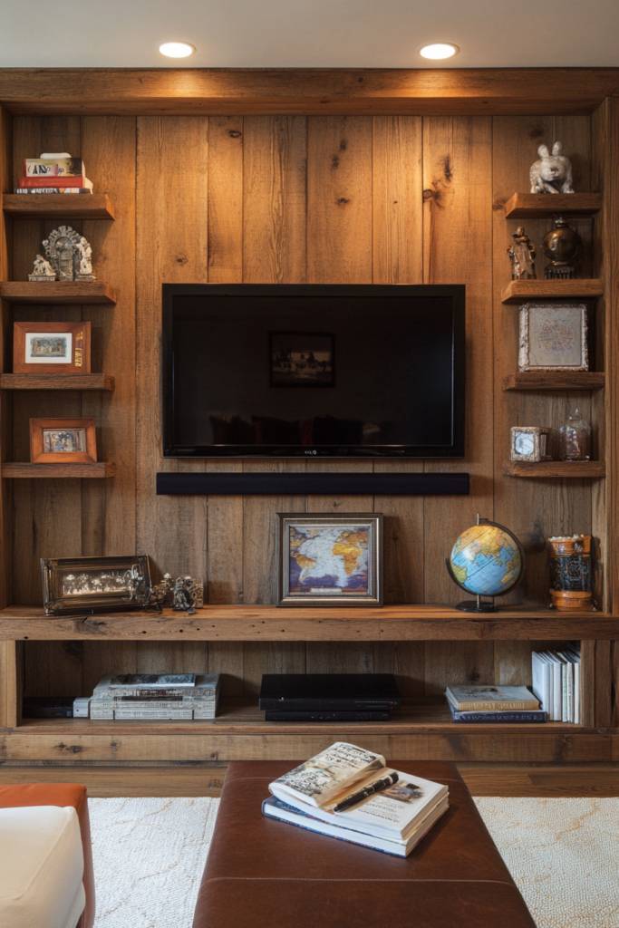 A rustic wood accent wall sets the perfect stage for showcasing integrated lighting solutions that elevate your TV area to new heights. Imagine sleek LED strips cleverly hidden along the edges of your shelf or behind your TV, casting a warm, inviting glow that enhances both your viewing experience and the wood’s natural beauty. You could opt for color-changing lights, allowing you to set the mood with a simple tap on your smartphone.