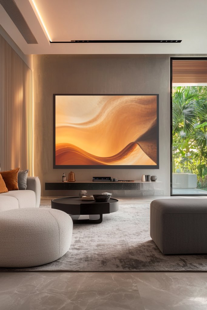 Consider rich velvet or soft linen in colors that complement your room’s palette. When you draw the curtains open, it reveals your TV like a piece of art, instantly enhancing the viewing experience.