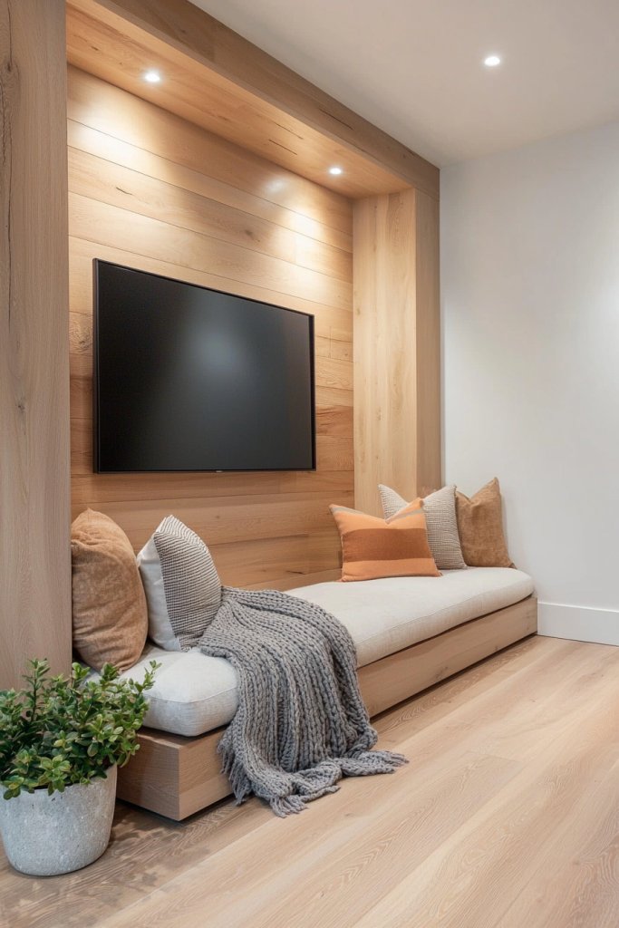 You can position your TV at eye level, surrounded by built-in shelves filled with books or decorative items that reflect your personality. Soft, ambient lighting from sconces or fairy lights can enhance the atmosphere, creating a perfect backdrop for movie nights or binge-watching your favorite series.