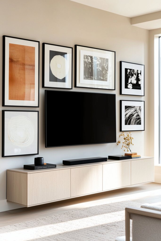 Consider incorporating personal touches, like family photos or your own creations, to make it uniquely yours. Finally, don’t forget to leave space for the TV; it can coexist beautifully with your gallery, blending technology and art in perfect harmony.