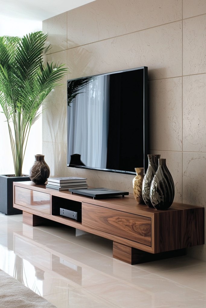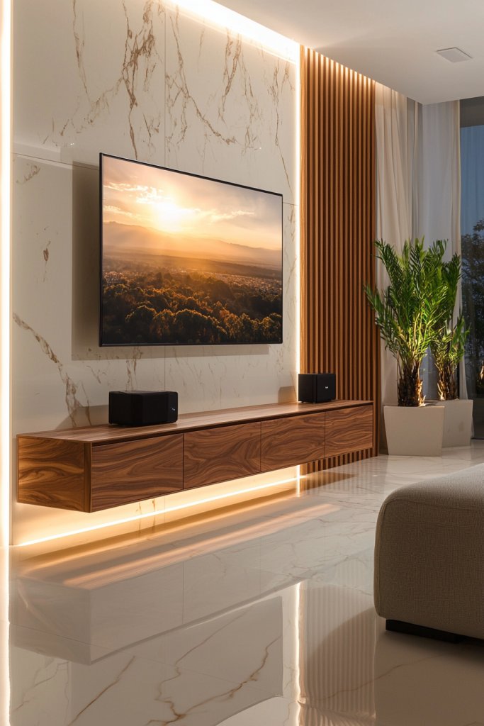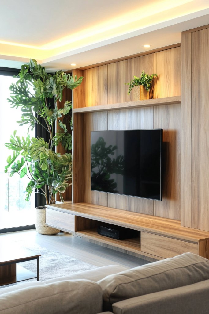 Picture vibrant greenery cascading down, with a variety of plants—from ferns to succulents—thriving in stylish vertical planters. As you sit back to enjoy your favorite show, you’ll appreciate how the foliage softens the room’s ambiance, while the hidden TV seamlessly blends into the backdrop.