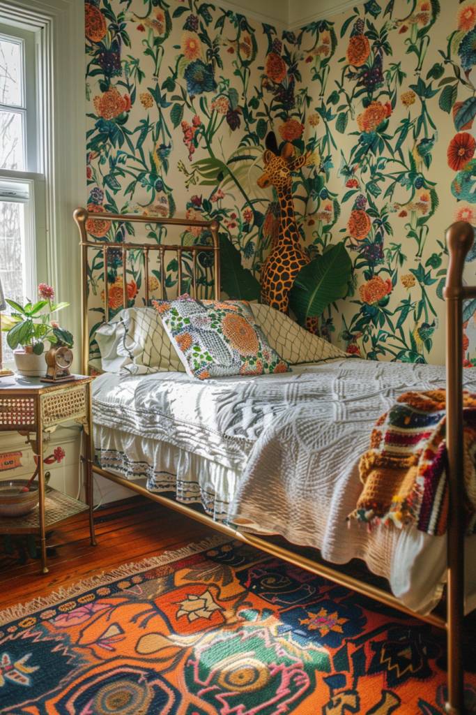 Pair your whimsical wallpaper with minimalistic furniture to let the design shine. Remember, it’s all about creating an environment that inspires joy and creativity, turning your bedroom into a reflection of who you are.