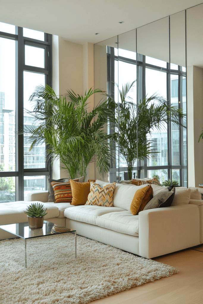 To create the illusion of a larger space in your apartment, mirrors can work wonders. By strategically placing them, you’ll reflect light and create depth, making your rooms feel more expansive. Consider a large, floor-length mirror in a narrow hallway or a statement piece above a sofa to draw the eye upward. You might also opt for mirrored furniture, like a coffee table or side table, which can add a touch of elegance while enhancing the sense of space. Don’t forget to use smaller mirrors in clusters on walls—they can add interest and playfulness. Just remember, the key is balance; too many mirrors can overwhelm, so choose thoughtfully to amplify your apartment’s vibe without cluttering.