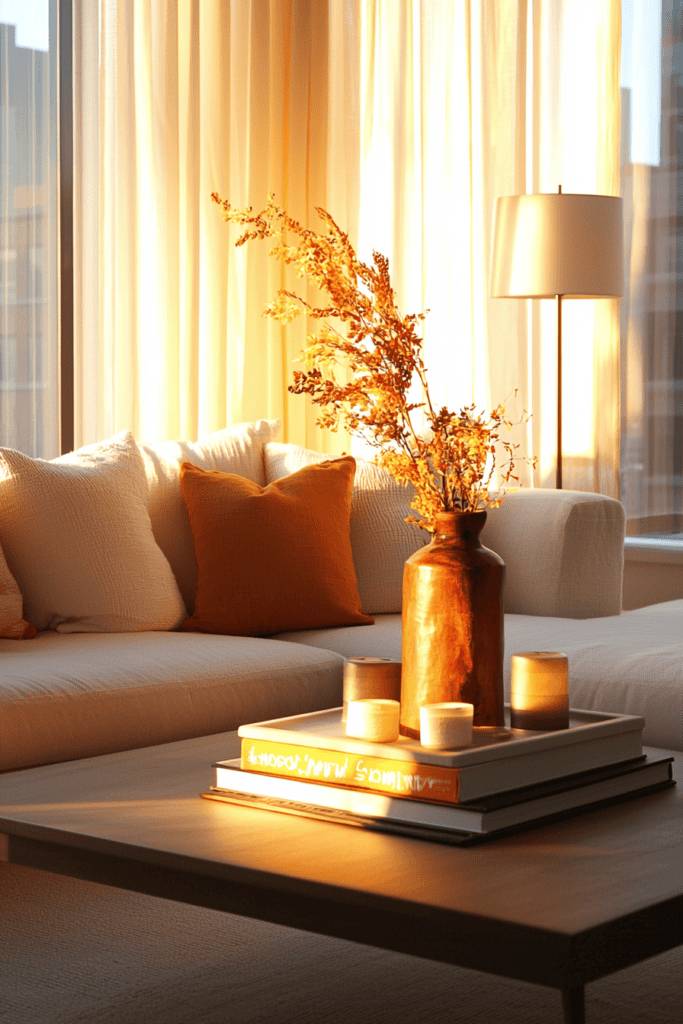 To create a warm and inviting atmosphere in your apartment, utilizing warm lighting is essential. Think soft yellows, gentle ambers, and subtle golds that create a cozy embrace. Swap out harsh fluorescent bulbs for warm LED lights, which mimic the natural glow of sunset. Layer your lighting by incorporating table lamps, fairy lights, and floor lamps to enhance depth and dimension. Don’t forget dimmers! They let you adjust brightness according to your mood or time of day. Consider using lampshades with textured fabrics—like linen or cotton—to diffuse light beautifully. Finally, place candles strategically around your space; their flickering flames bring an intimate warmth that’s hard to beat. With these tips, your apartment will feel like a snug sanctuary.