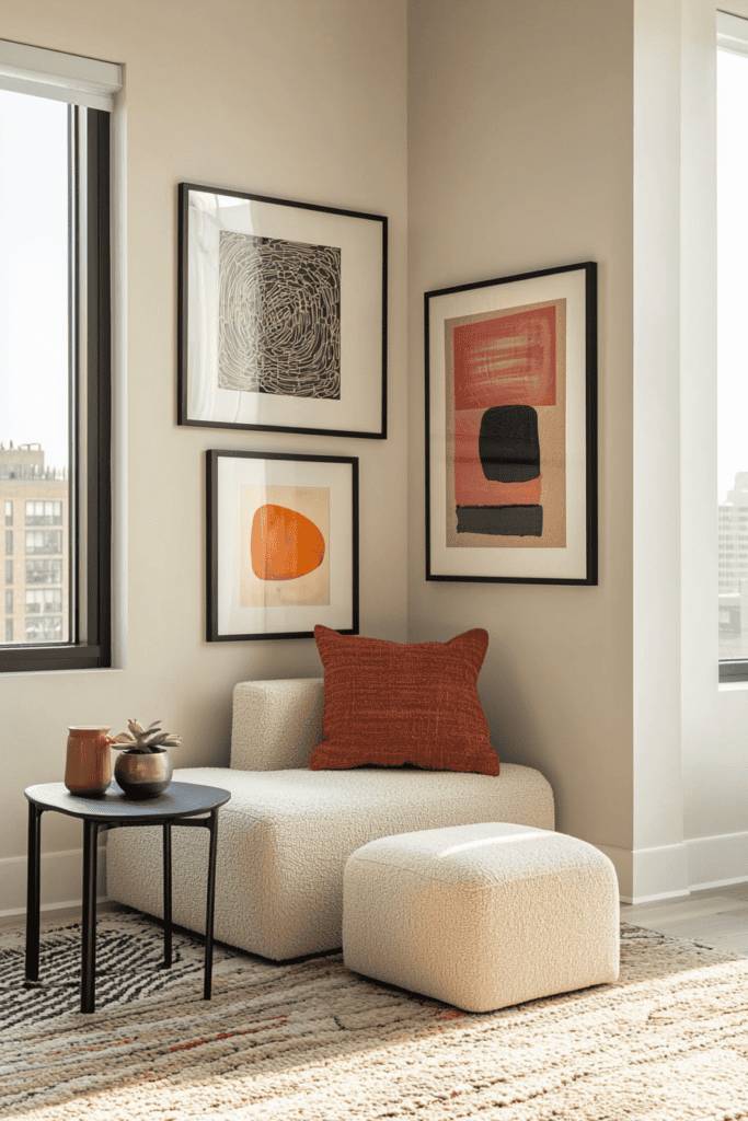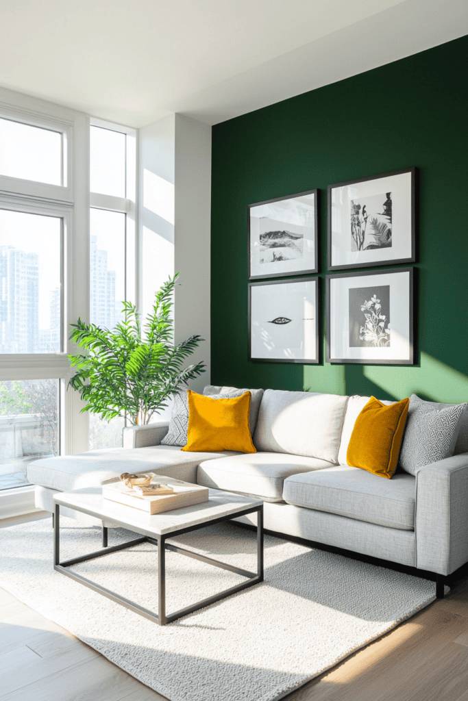 Once you’ve established a striking accent wall, consider adding another layer of character with a gallery wall. This isn’t just about hanging pictures; it’s a curated collection of your personality. Start with a mix of frames—some sleek, some vintage—to create visual interest. Layer artwork, photographs, and even fabric pieces to add depth. Don’t shy away from varying sizes and orientations; it brings an eclectic vibe. Arrange your pieces on the floor first to find the perfect layout, ensuring balance and flow. Remember, it’s all about telling your story. You might include travel souvenirs or personal art. Once you’ve hung everything, step back and appreciate how your gallery wall transforms the space into a true reflection of you.