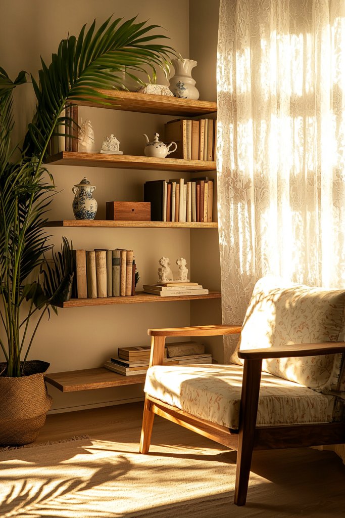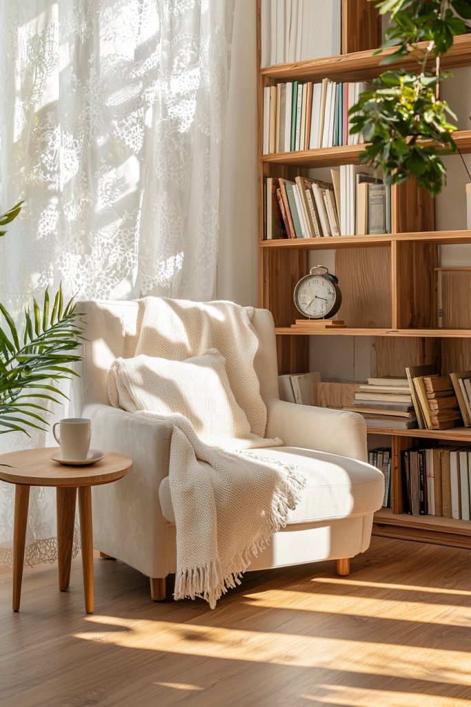 Layer soft textiles—a plush throw blanket and an oversized pillow or two on a vintage armchair invite comfort. Surround yourself with bookshelves, filled with your favorite reads, or display a curated selection of well-loved volumes.