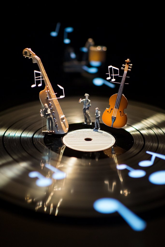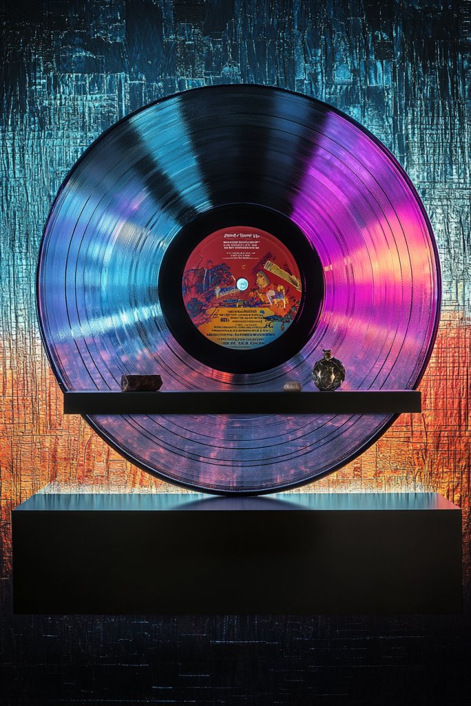 Visualize small decorative elements—miniature instruments, musical notes, sound waves—attached to a record to form a lively scene or abstract design. These elements pop out from the surface, creating a layered, playful effect. The vinyl acts as a canvas that holds your creative additions, turning a simple record into a three-dimensional showcase. When viewed from different angles, the depth and shadows add visual interest.