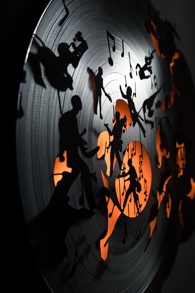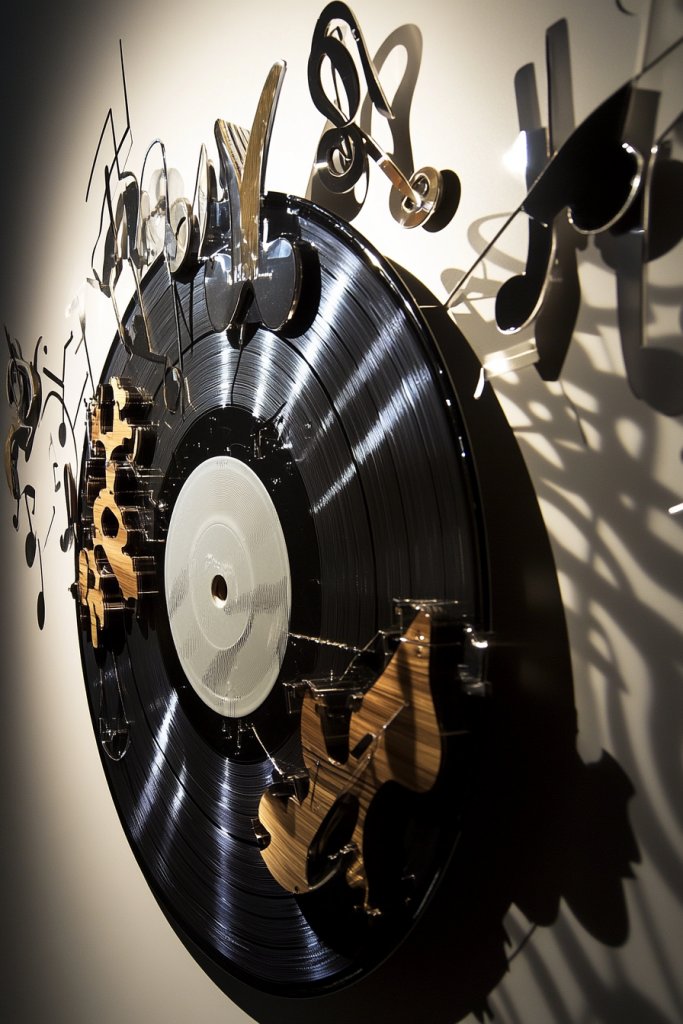 Imagine a vinyl record mounted with raised or layered components like musical notes, instrument shapes, or sound wave patterns. These elements protrude from the wall, creating shadows and tactile interest. Combining different materials—metal, wood, or acrylic—enhances the layered effect. When lit from different angles, the shadows dance, making the piece come alive.