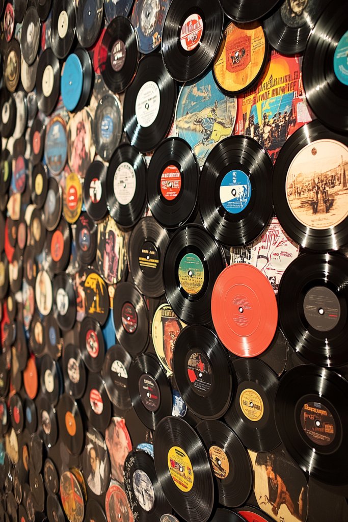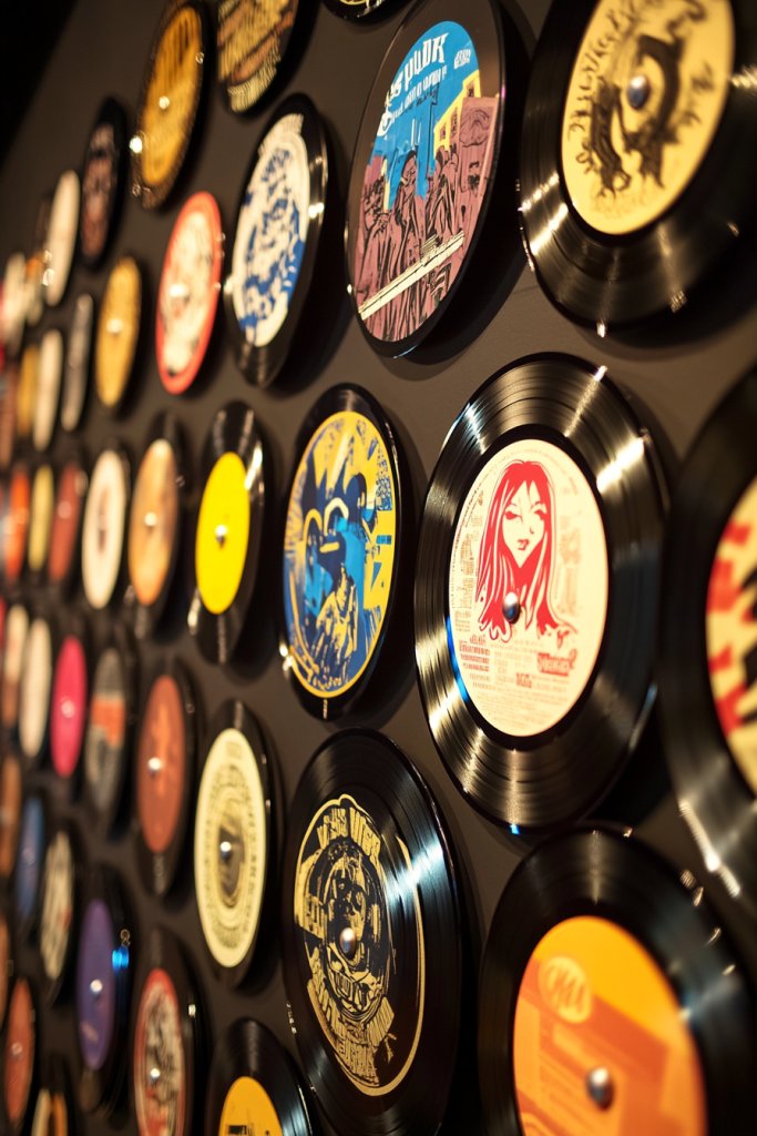 Picture a carefully planned layout of records, each with different colors—matte black, glossy brights, textured finishes, or painted accents. By alternating these elements, you create rhythm and movement across the wall. The textures catch light differently, adding depth and intrigue. The overall effect is a vibrant mosaic that embodies sound, color, and energy, transforming your space into a visual symphony.