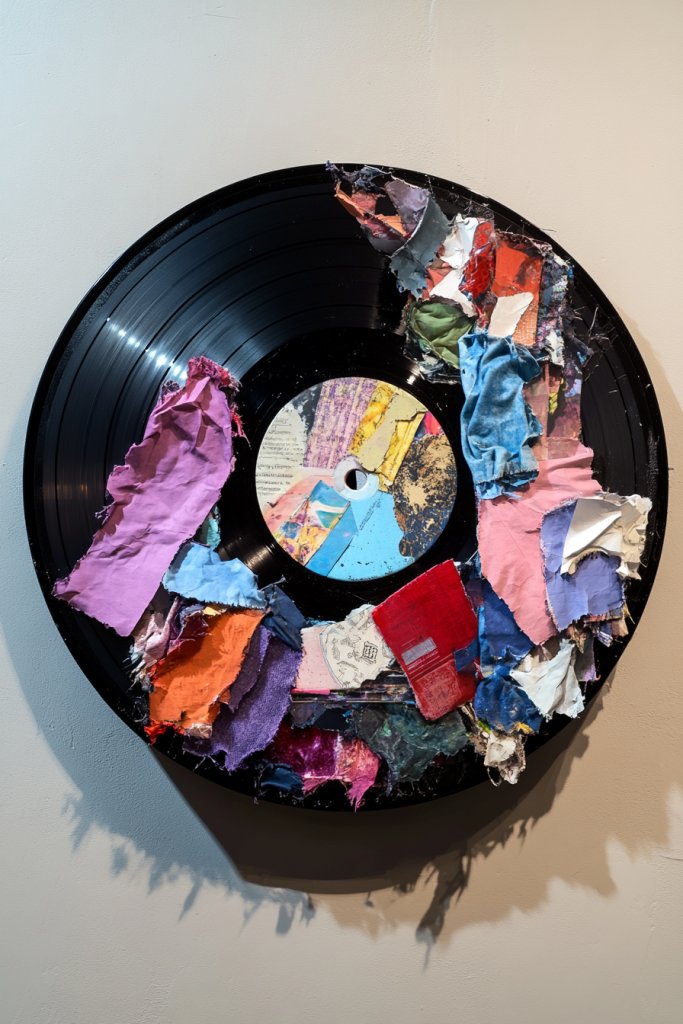 Imagine a record covered in collage, paint, fabric, or textured materials—creating layers and depth. You might add torn paper, fabric swatches, or even small sculptural elements directly onto the surface. The result is a vibrant, tactile artwork that tells a story or evokes emotion. When hung, it becomes a captivating focal point that invites viewers to explore every detail.