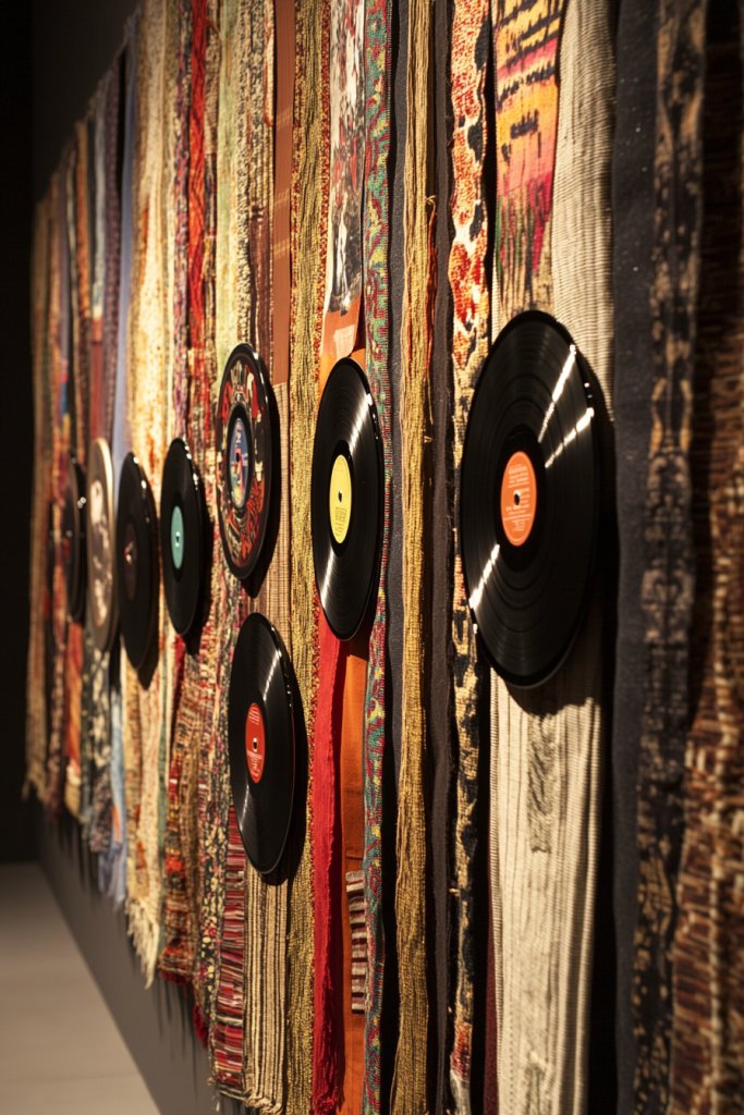 Imagine records hung as focal points, interwoven with woven textiles, scarves, or fabric strips. The tactile fabrics contrast beautifully with the glossy vinyl, adding softness and depth. Incorporate musical-themed textiles or patterns that echo your favorite genres. When illuminated gently, the fabric and vinyl create a layered, textured visual that feels warm and personal.
