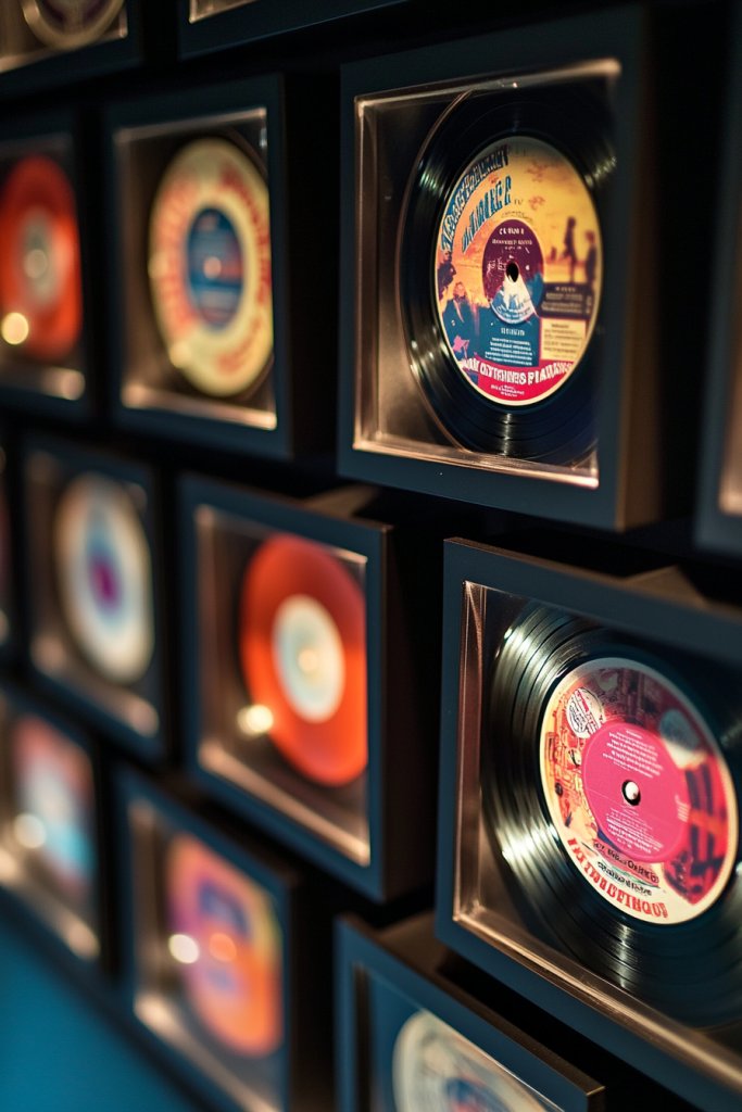 Choose vintage records with intact labels and minimal damage. Select frames that complement the record’s character—wooden, metal, or ornate. Use appropriate mounting hardware to secure each record in the frame without damaging the vinyl. Hang the framed records at eye level, ensuring even spacing. For a cohesive look, align the frames carefully and keep the arrangement symmetrical or intentionally asymmetrical for artistic flair.
