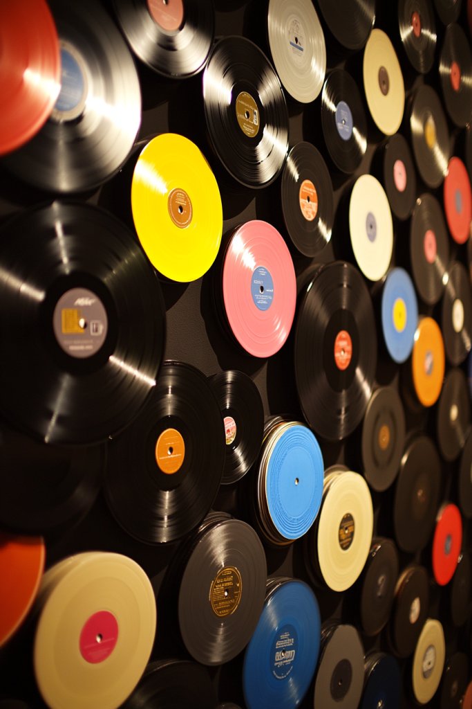 Visualize a large-scale collage of records spanning an entire wall, arranged in a dynamic pattern. Mix vintage album covers with plain black vinyls for contrast. The mural feels alive, with overlapping layers and varied sizes creating depth. When lit properly, it becomes a captivating backdrop for your daily life or entertaining guests. The colorful labels and iconic artwork draw the eye and spark conversations.